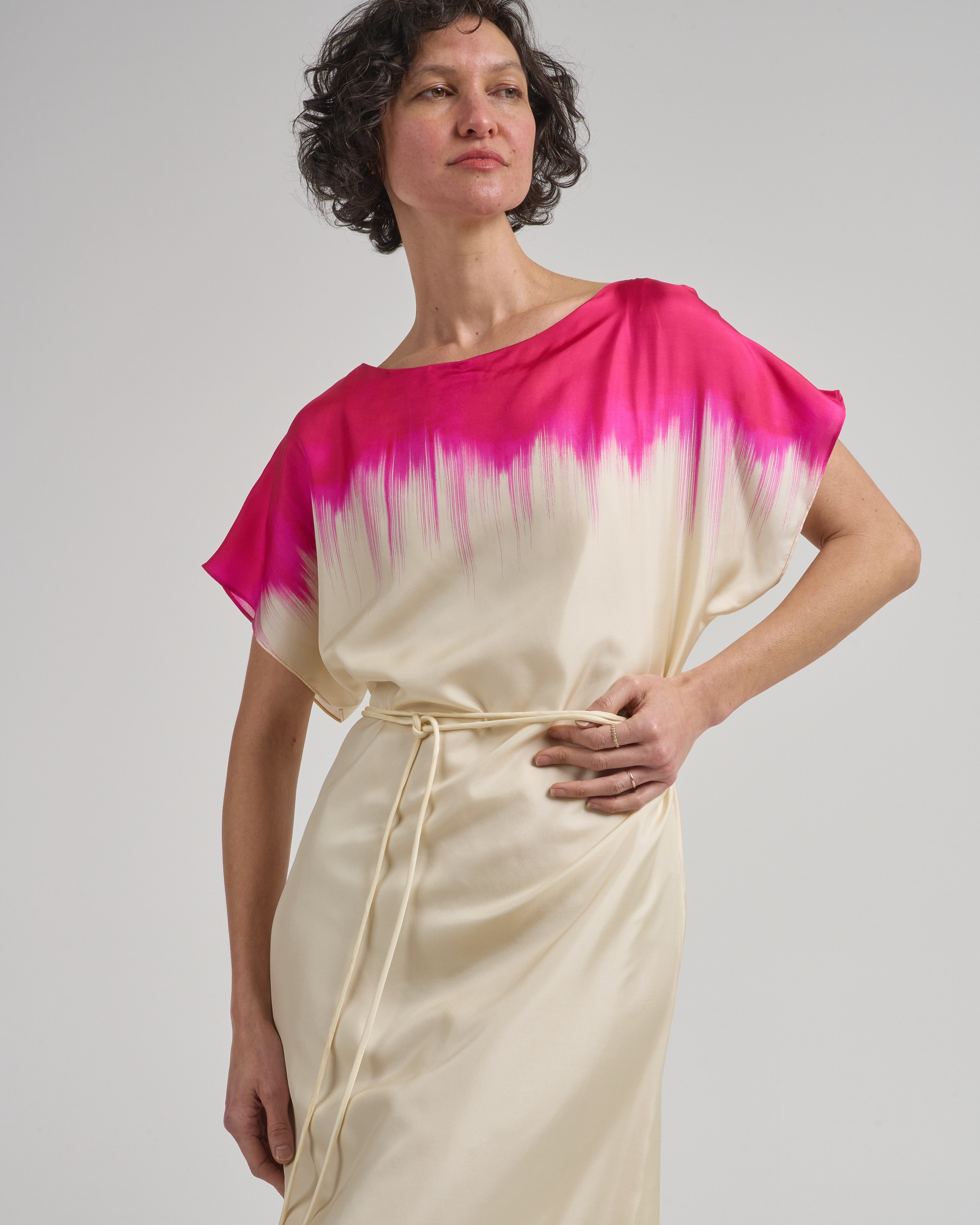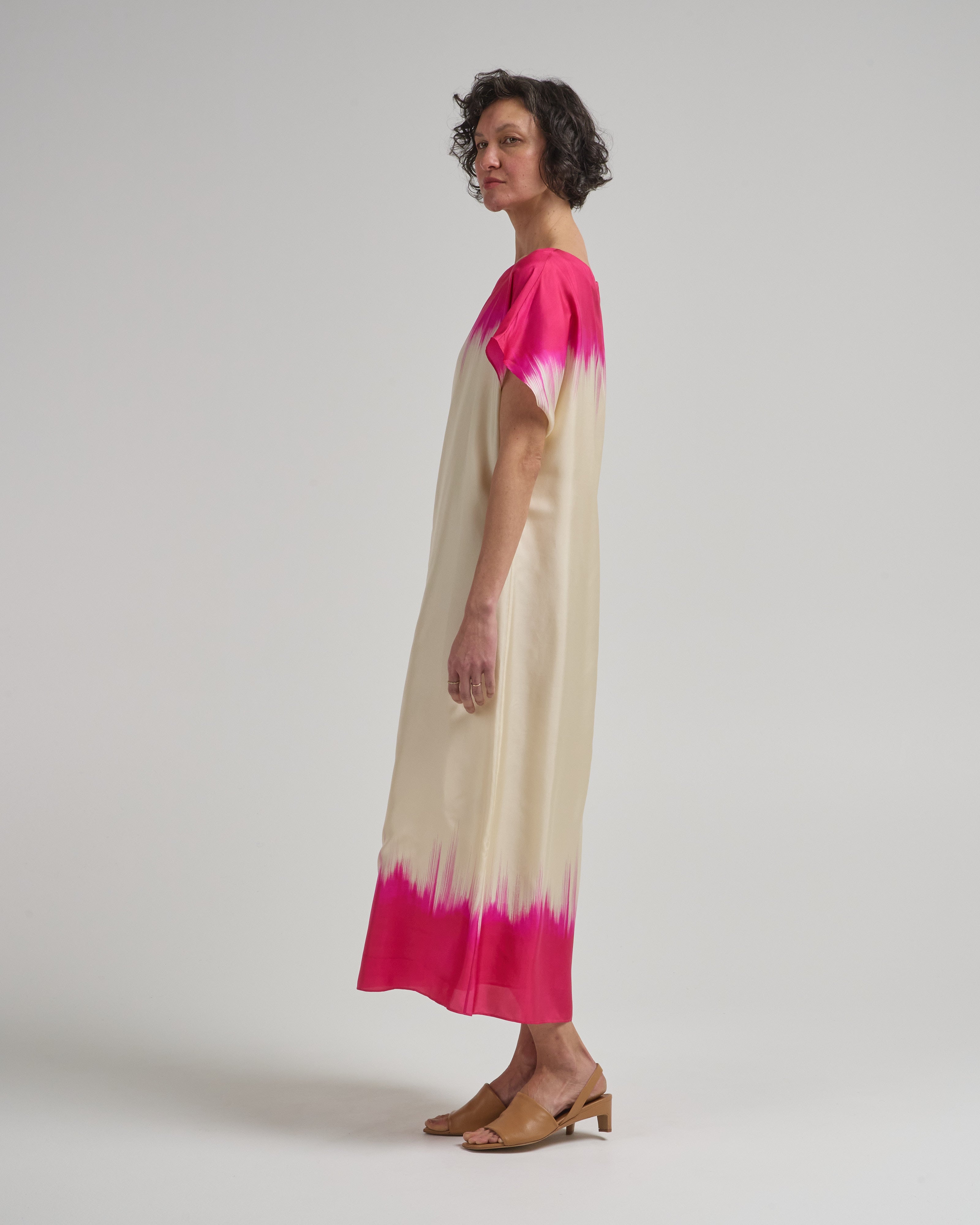 - pink and beige short sleeve dress