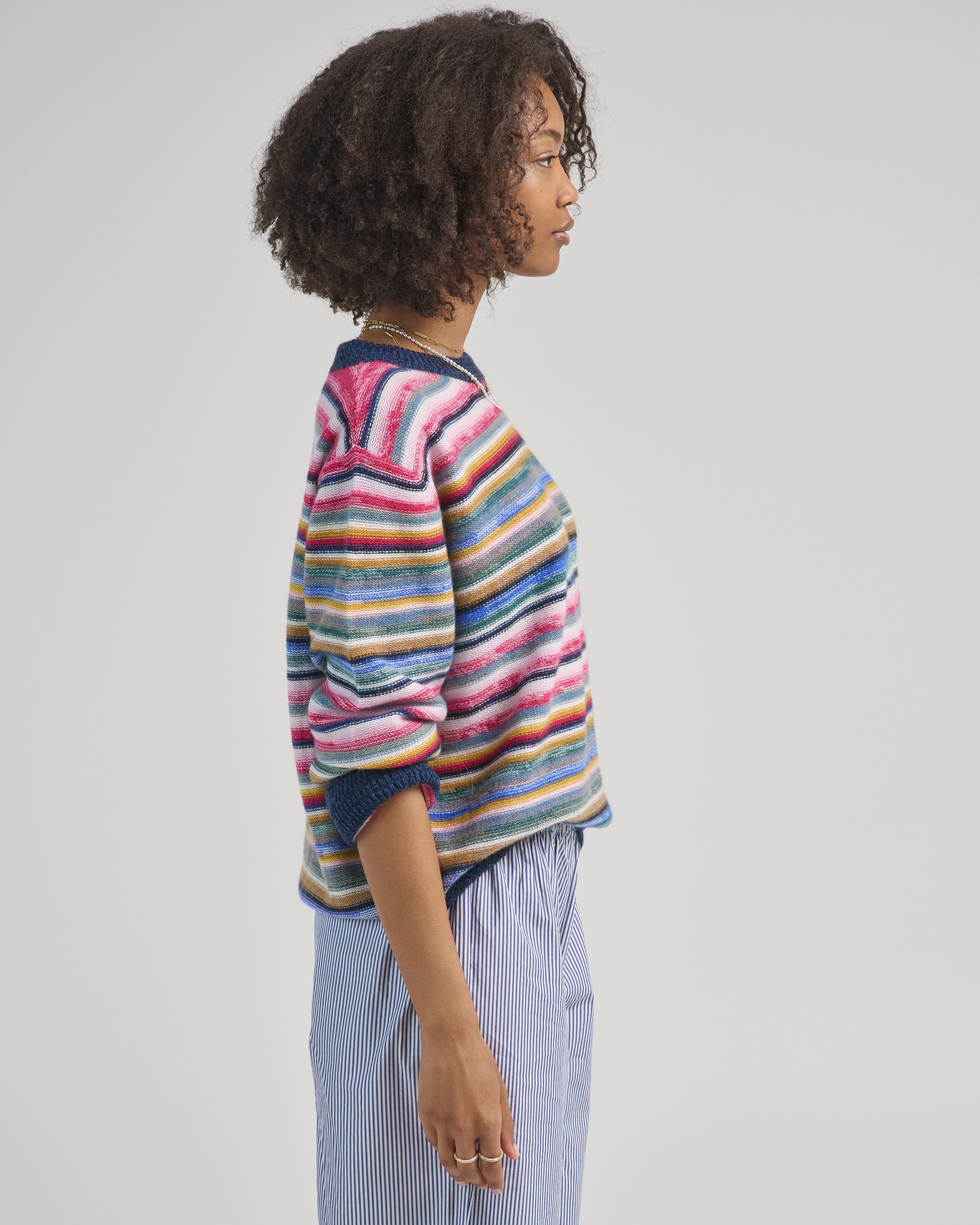 - multicolored striped long sleeve sweater
