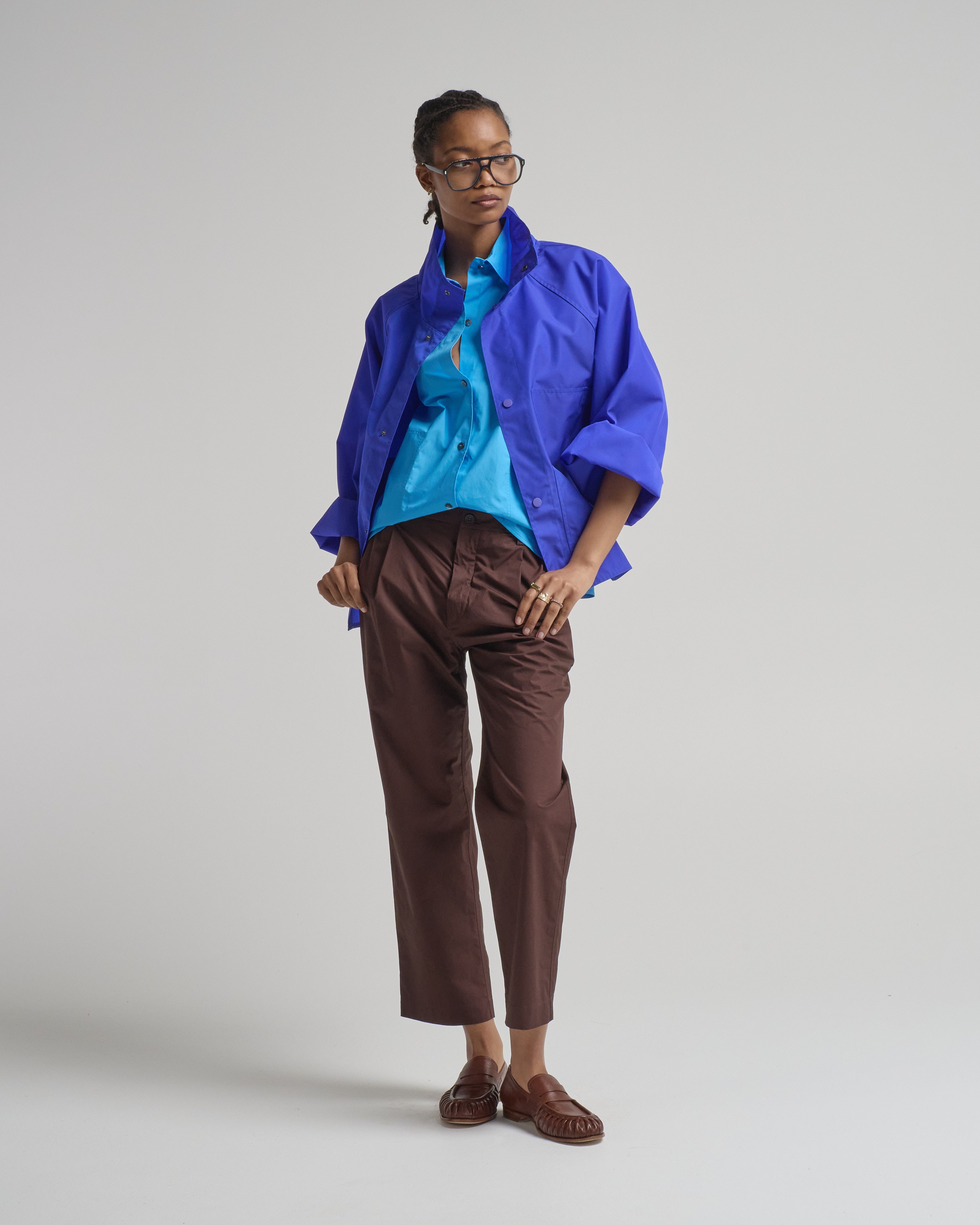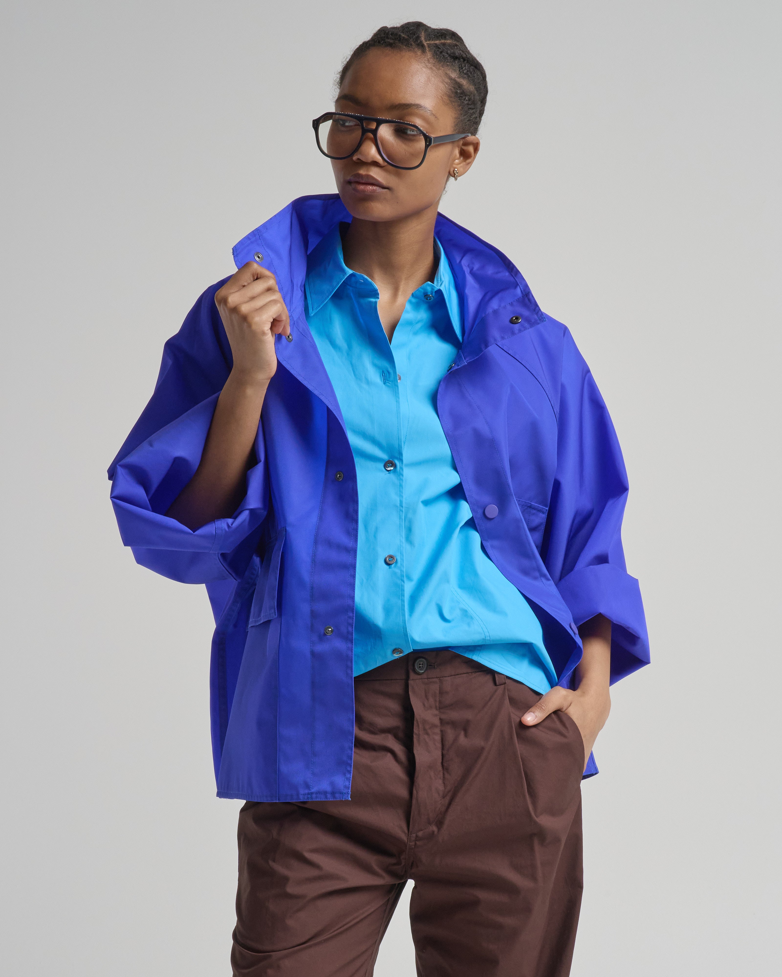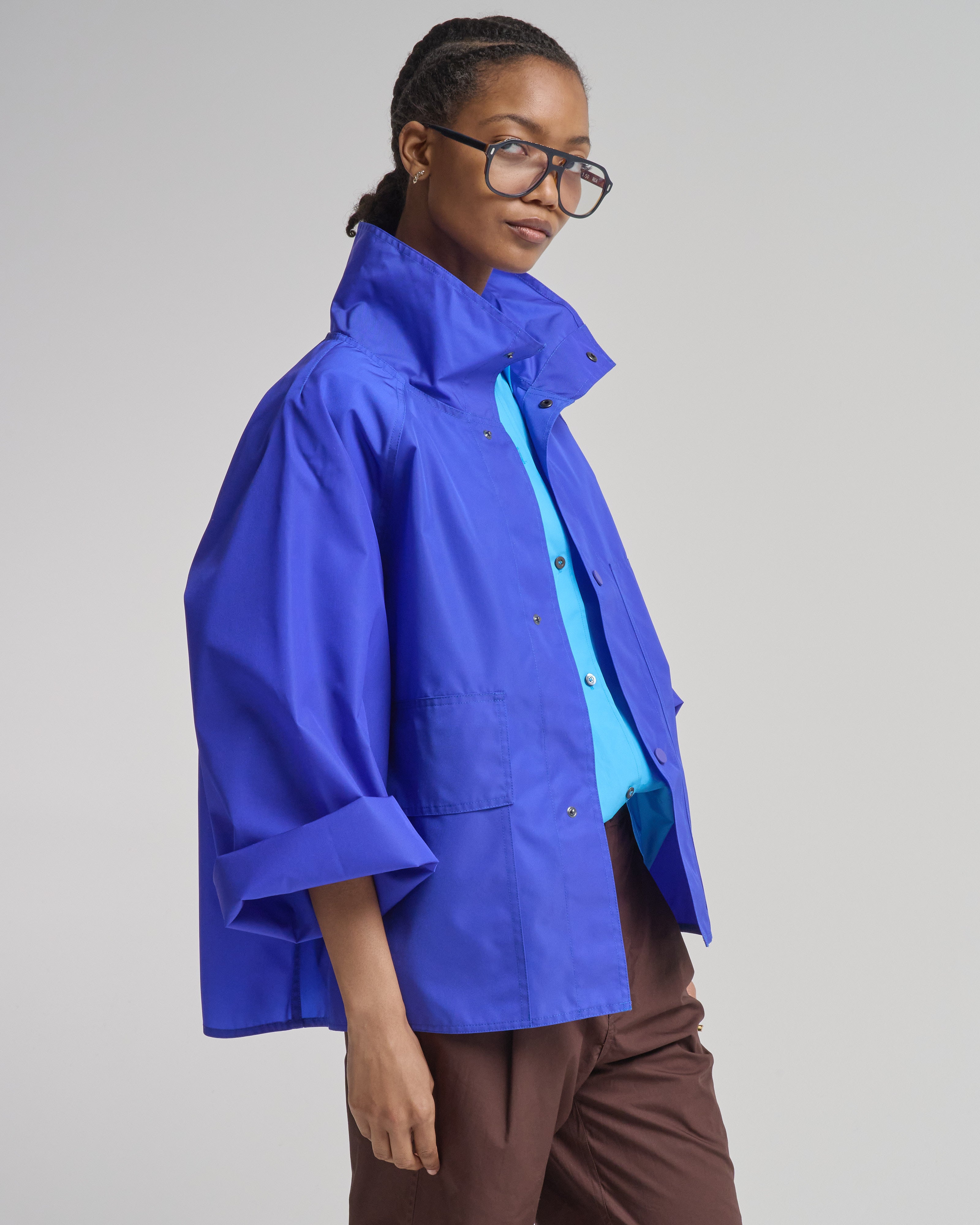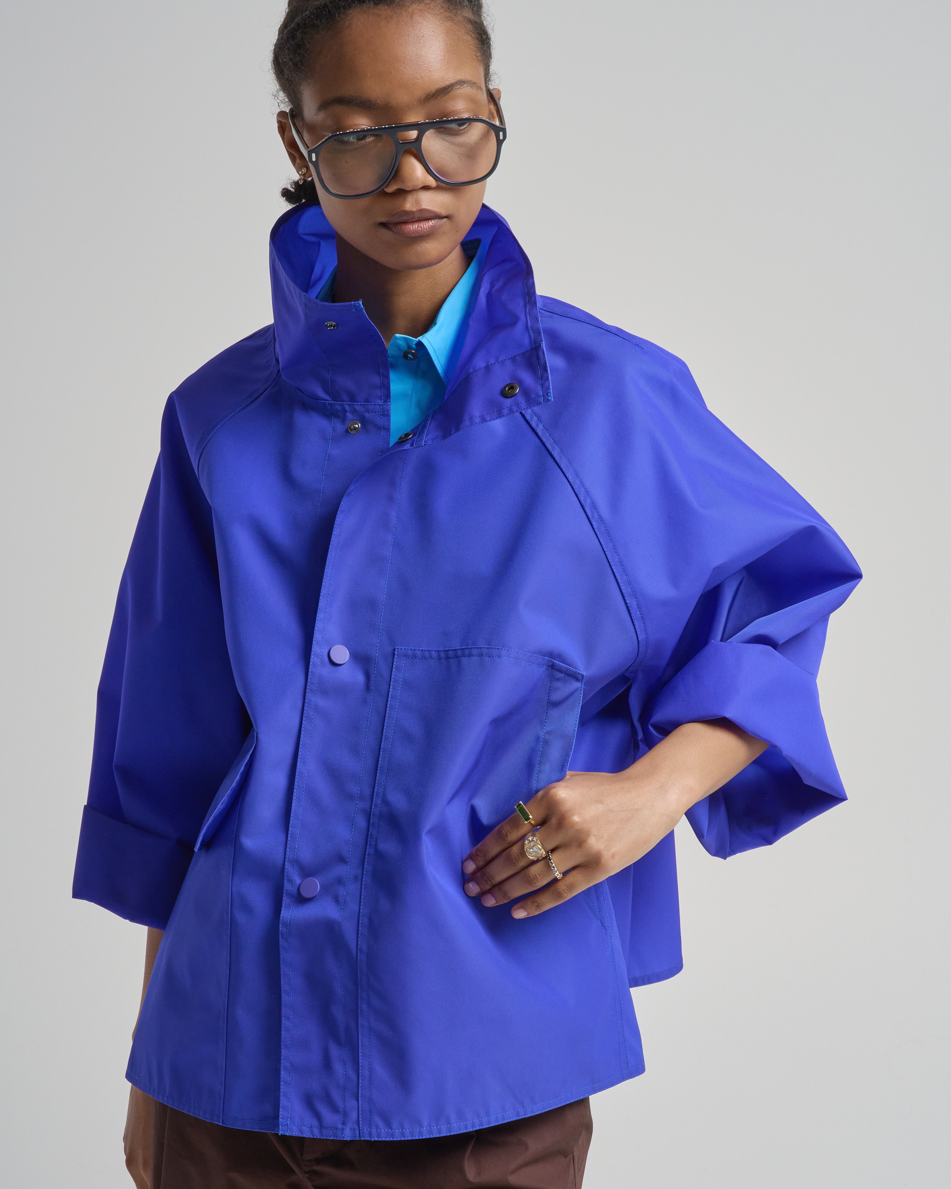 - bright blue long sleeve jacket