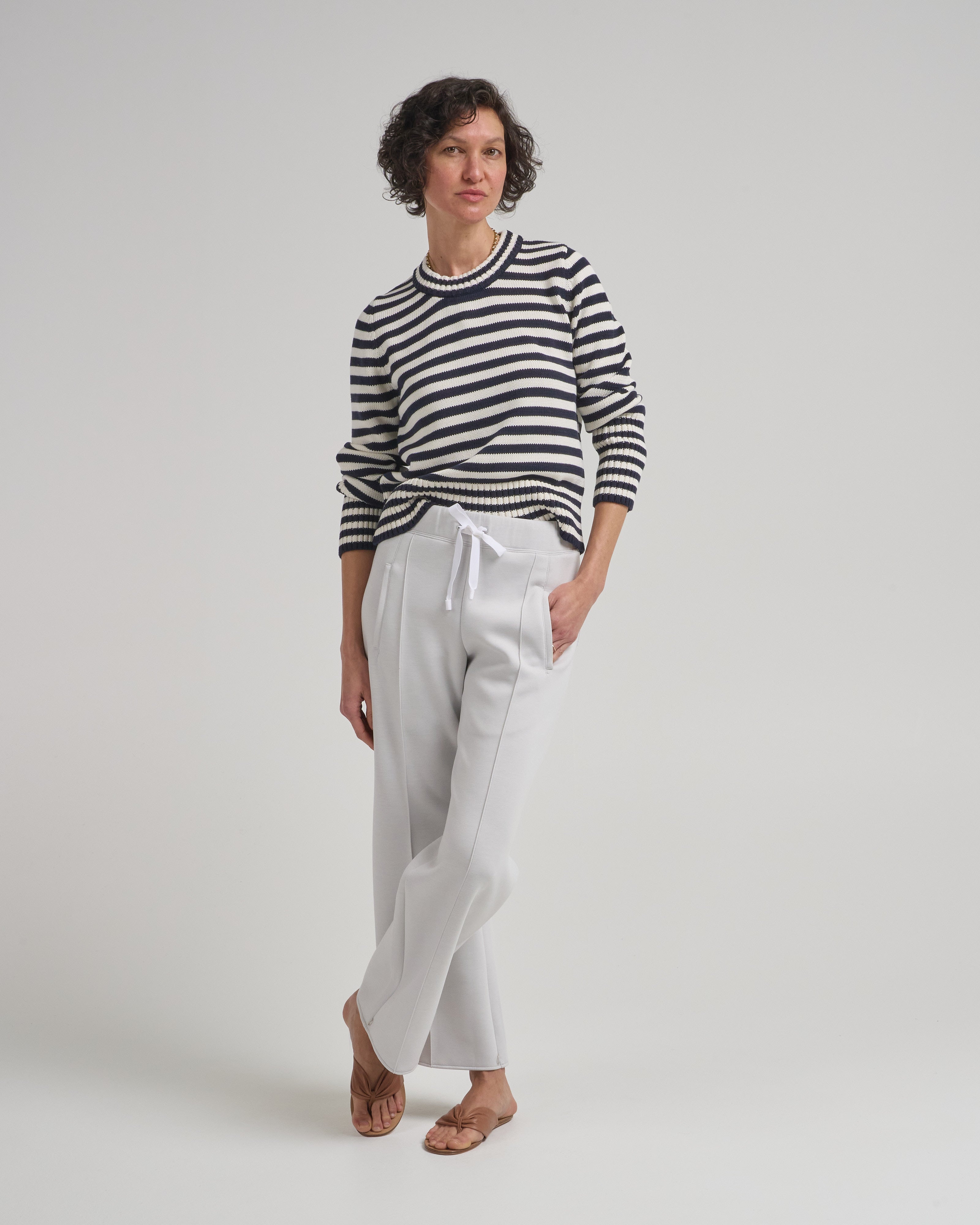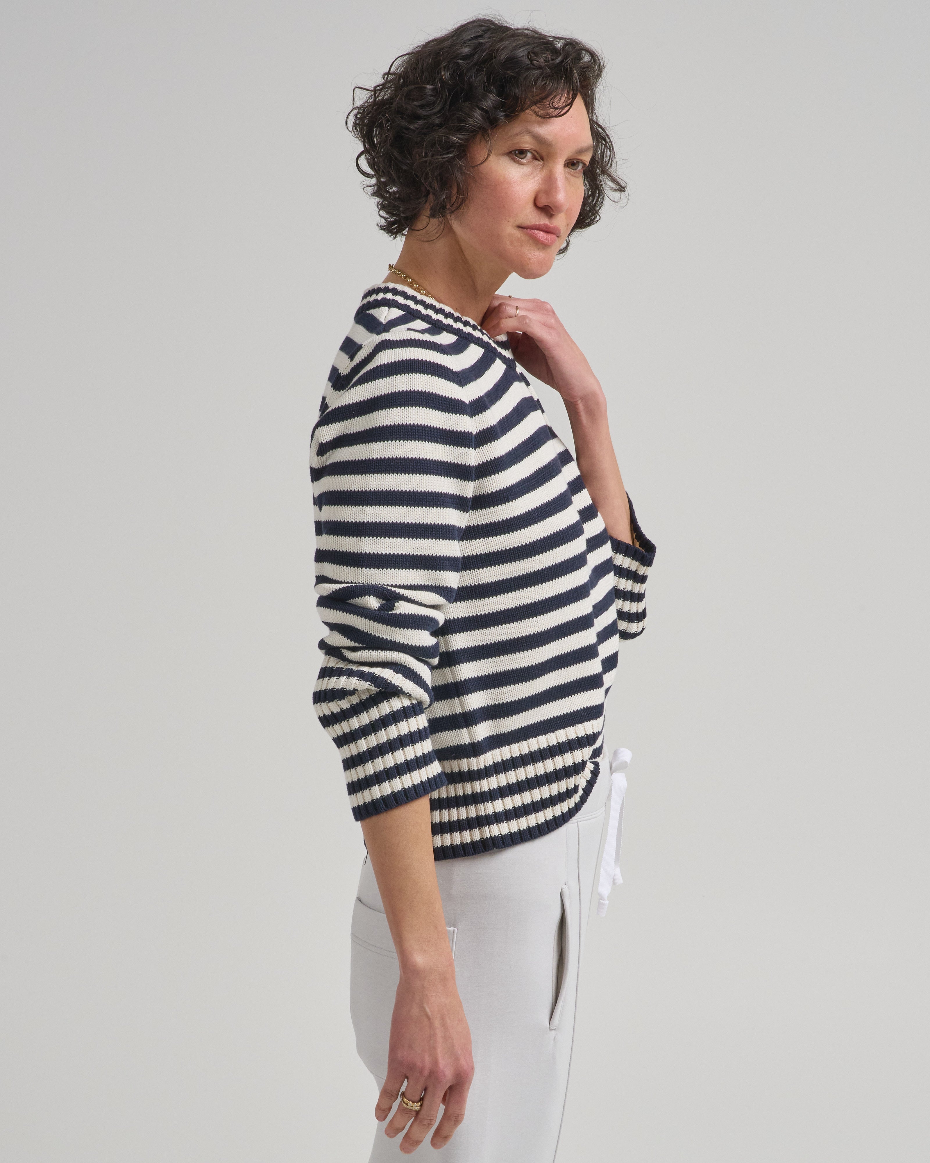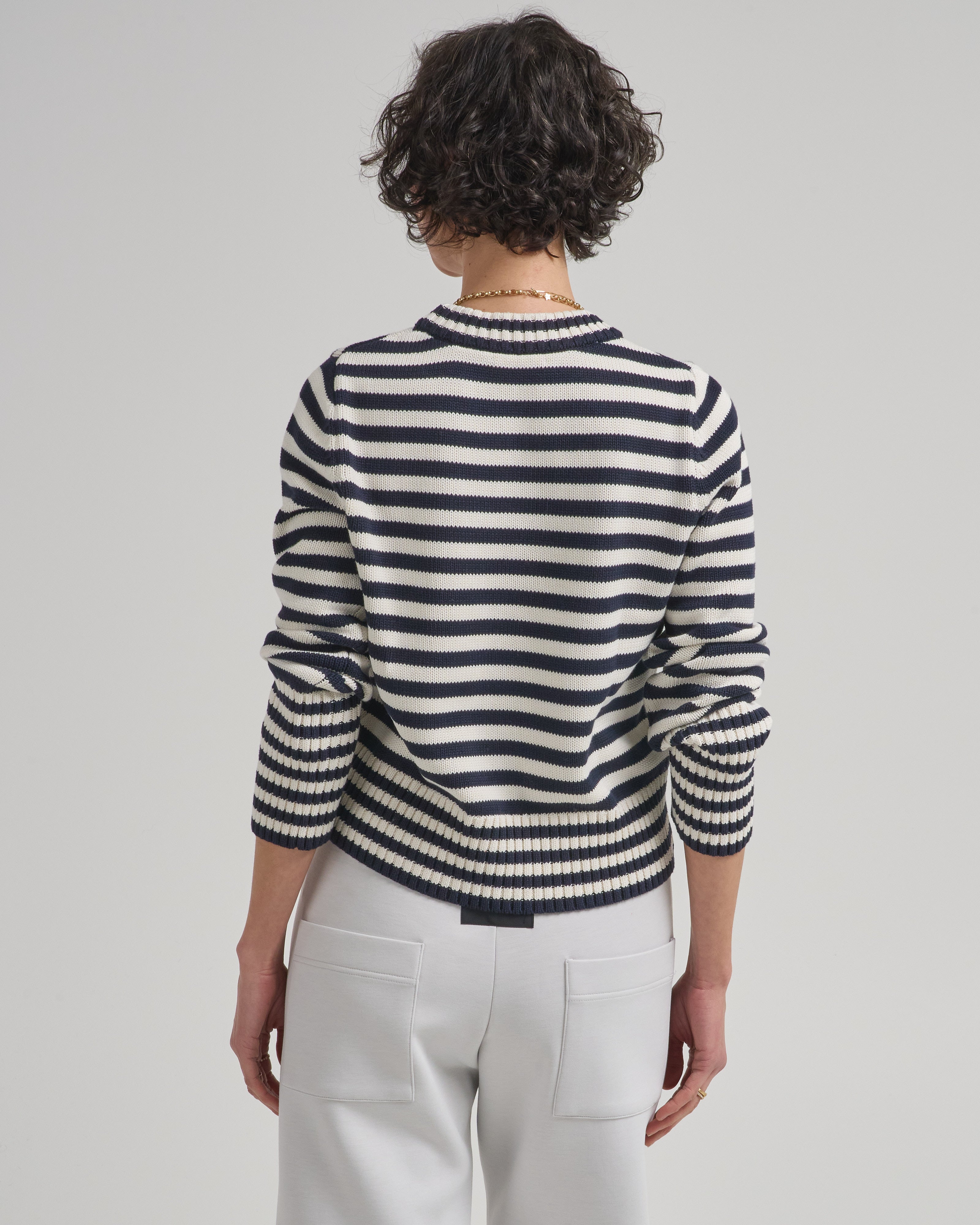- navy and off white striped long sleeve sweater