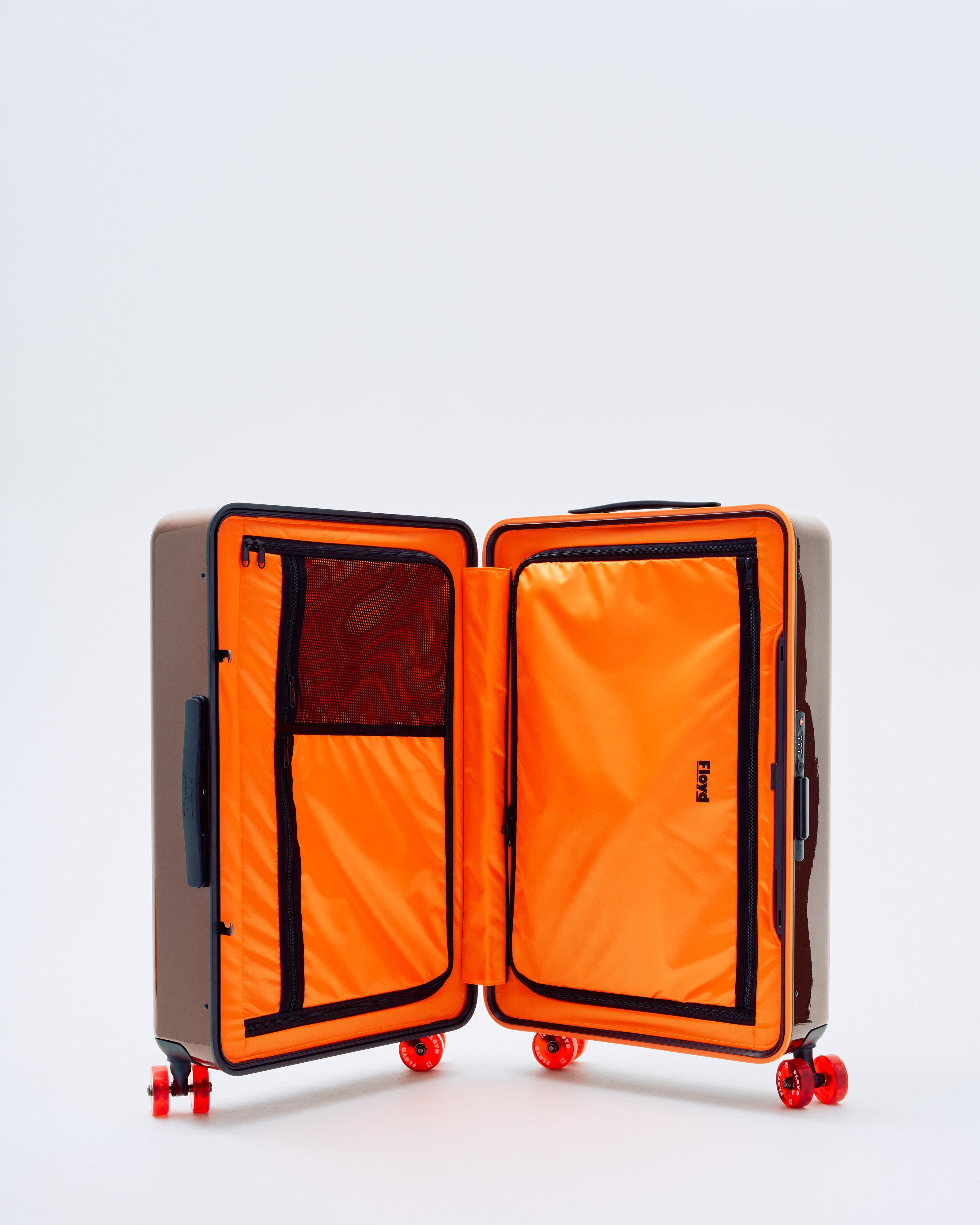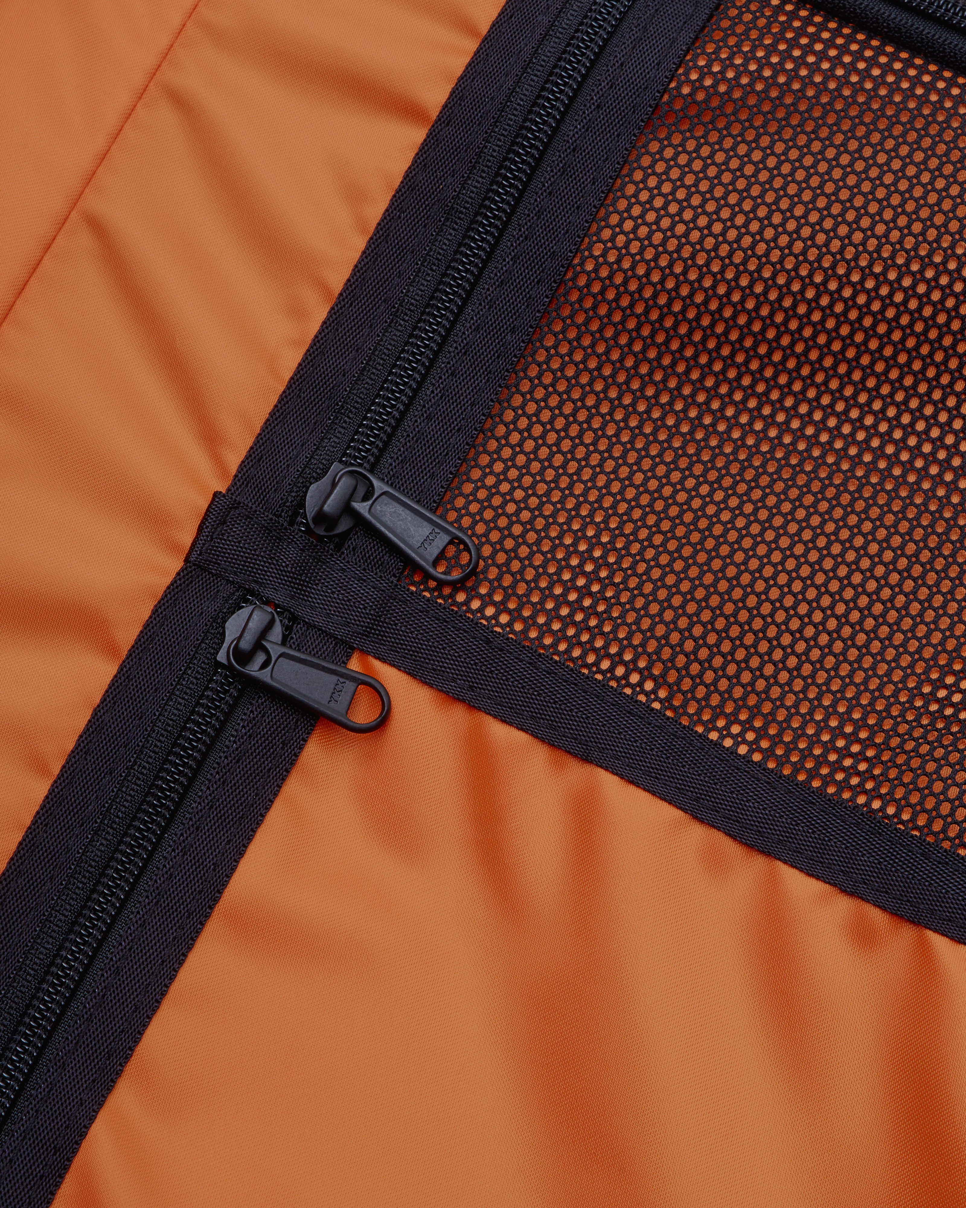 two zippered interior sections in signature orange lining