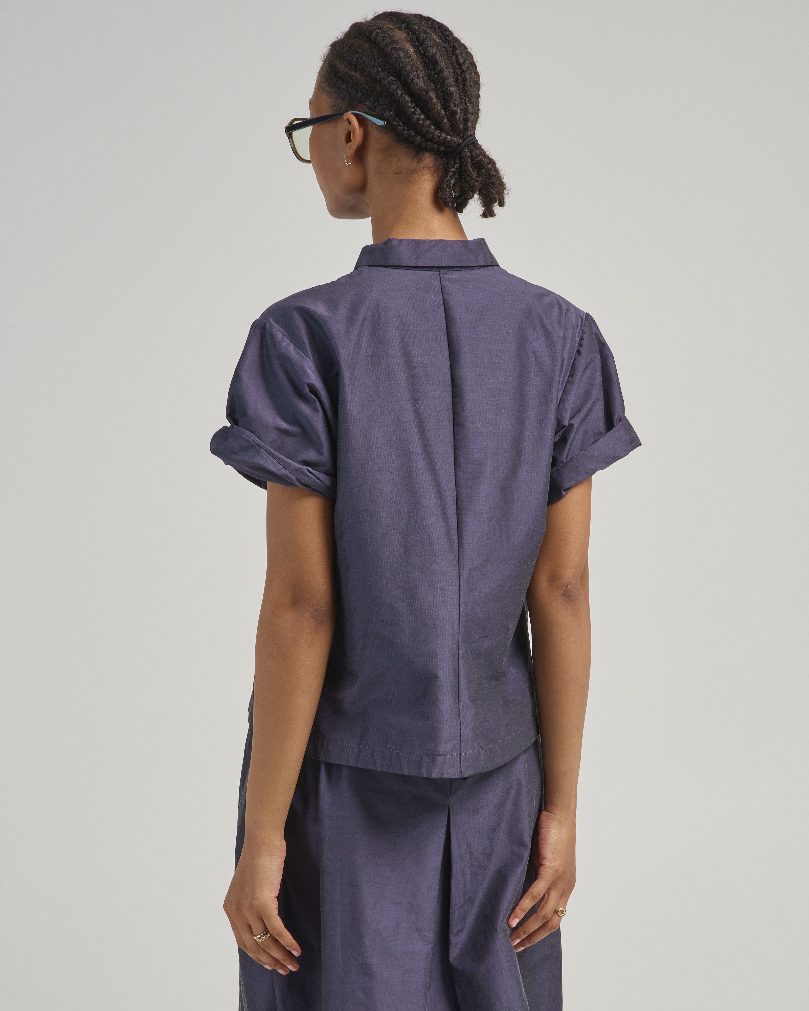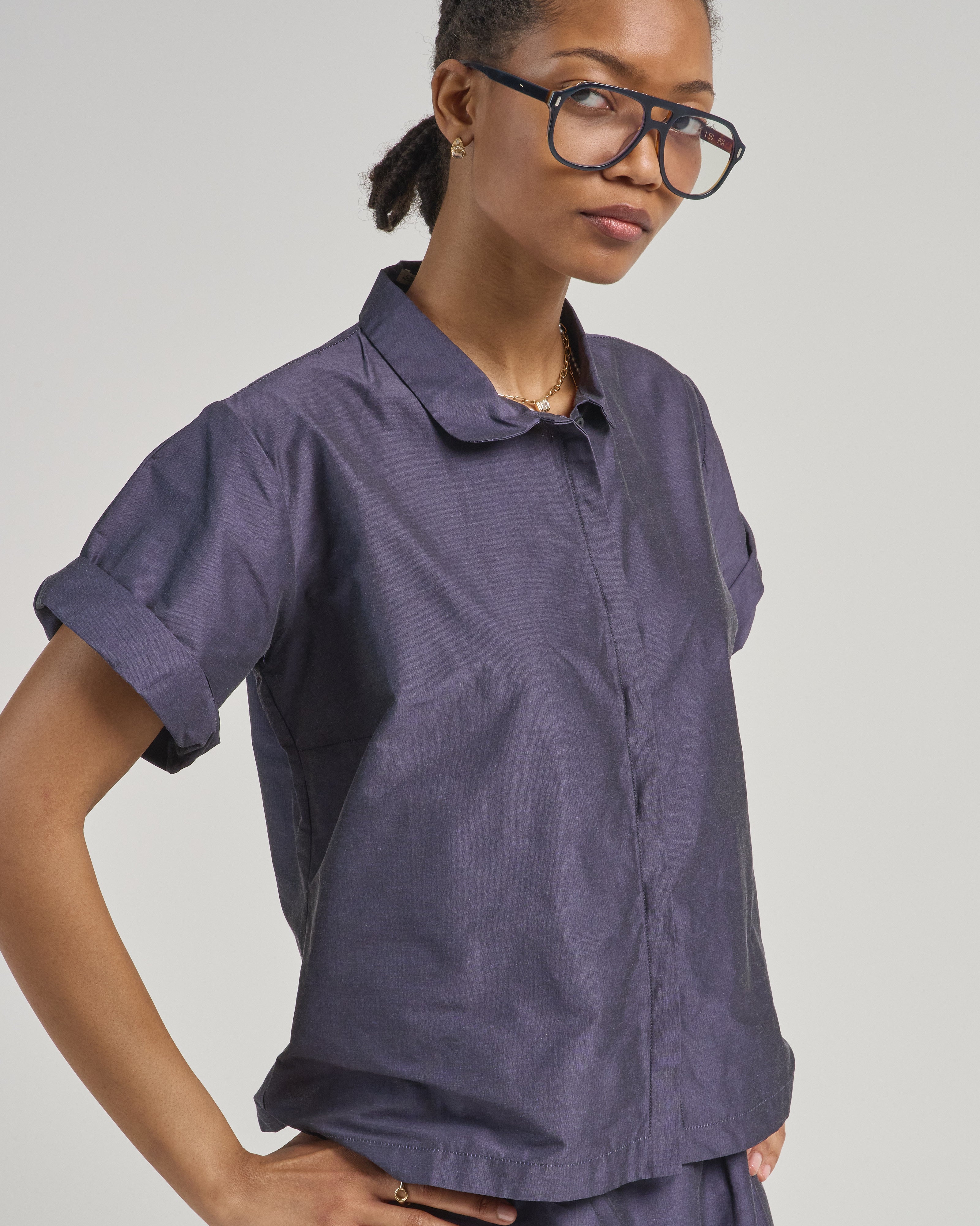 - blue short sleeve button up blouse