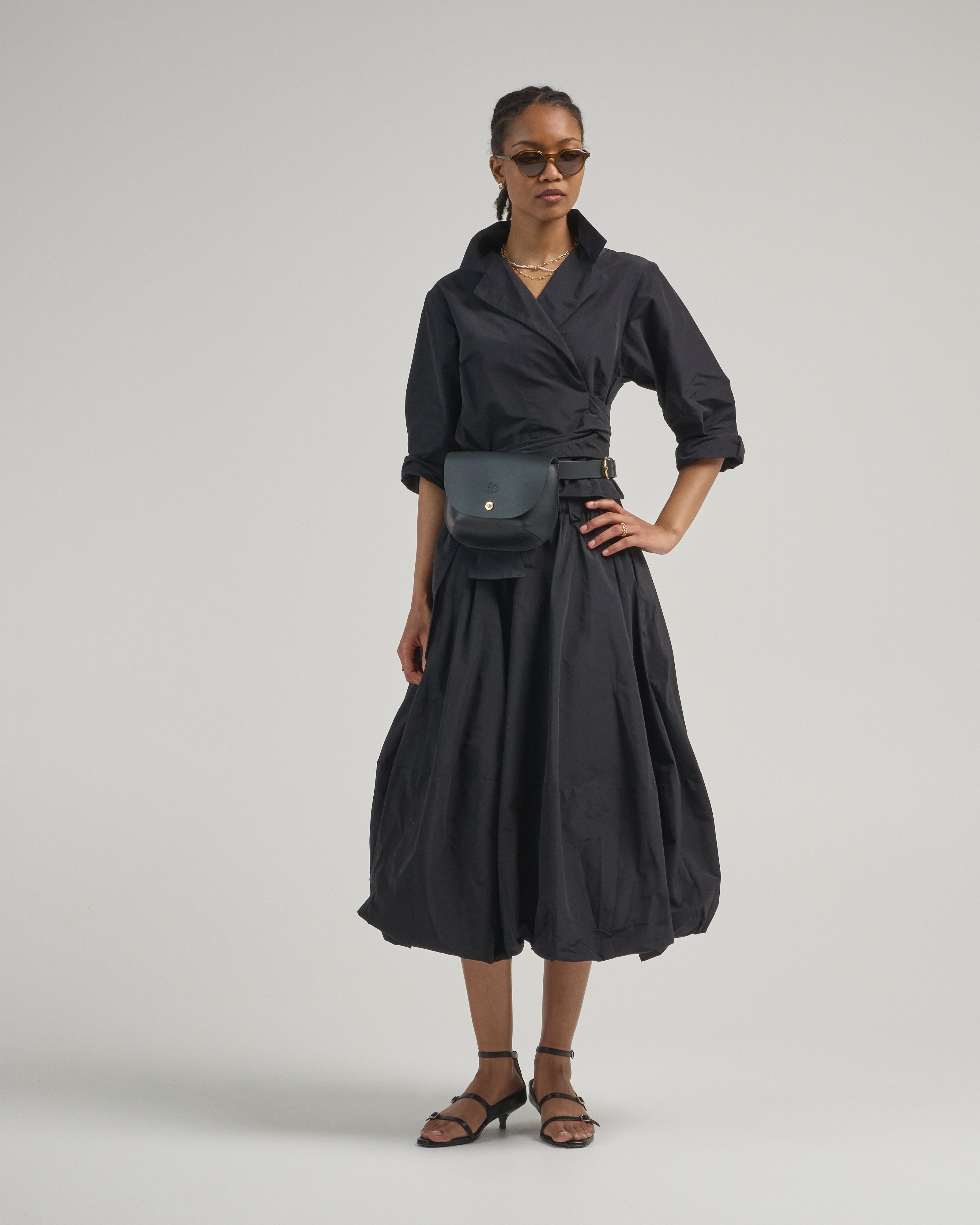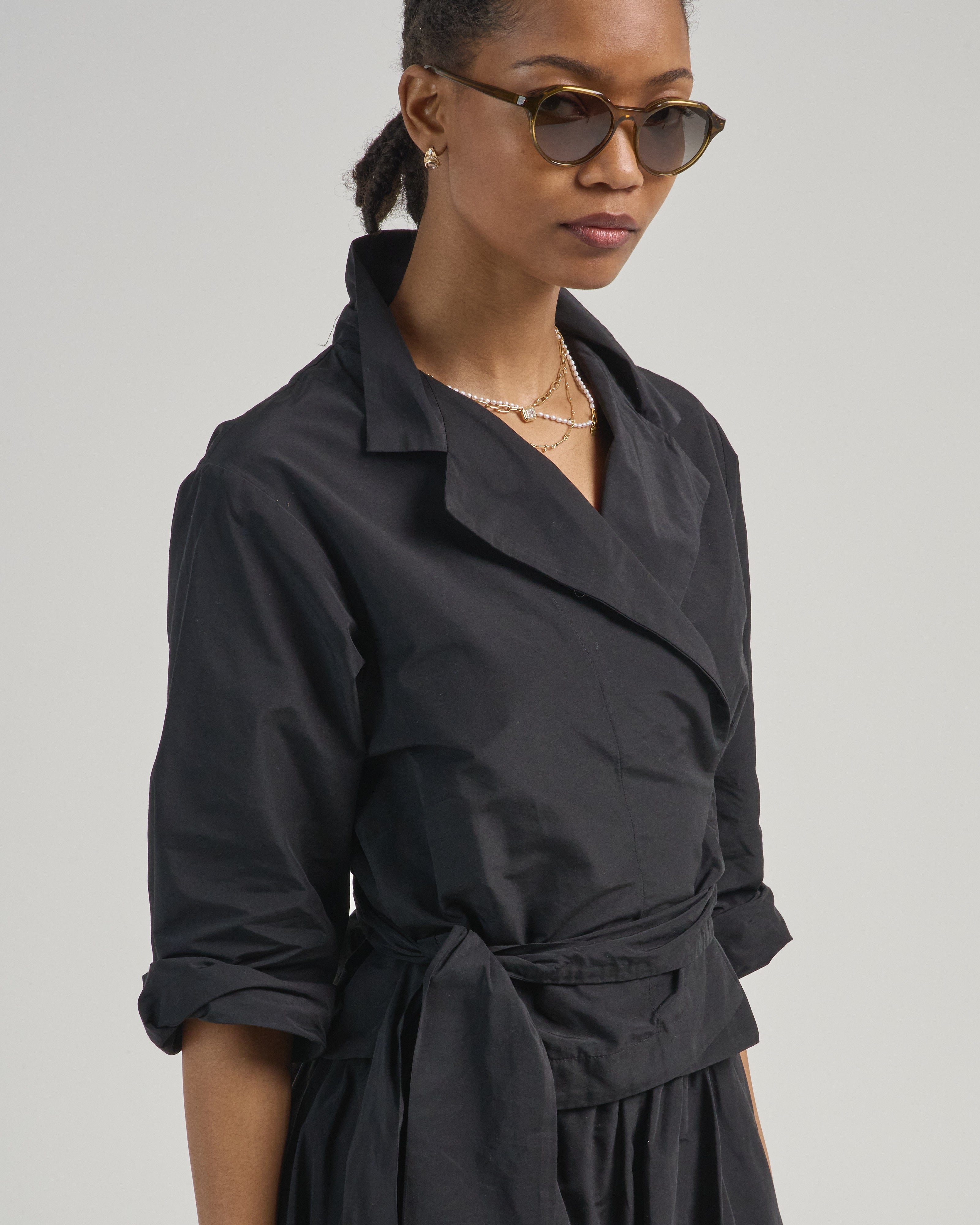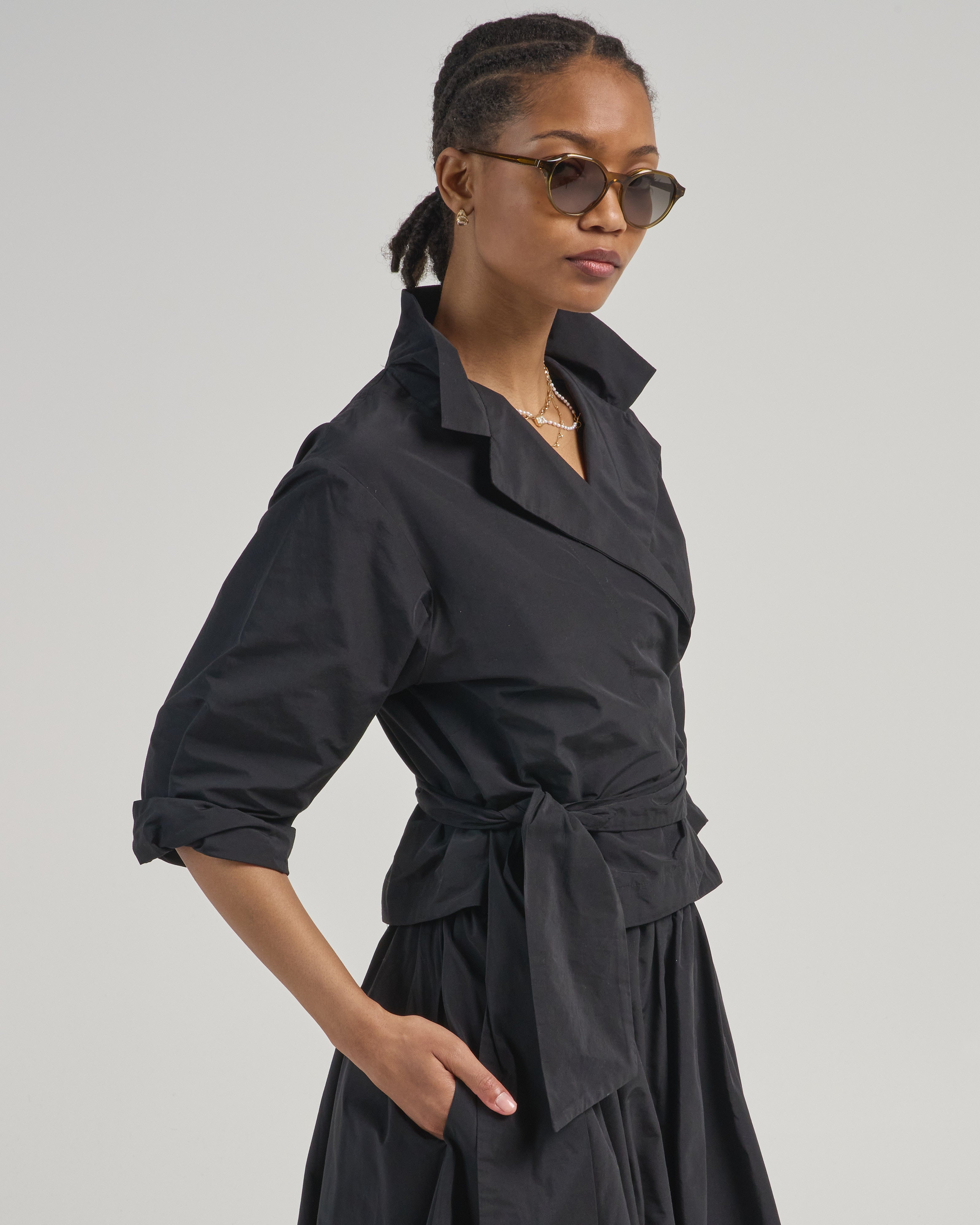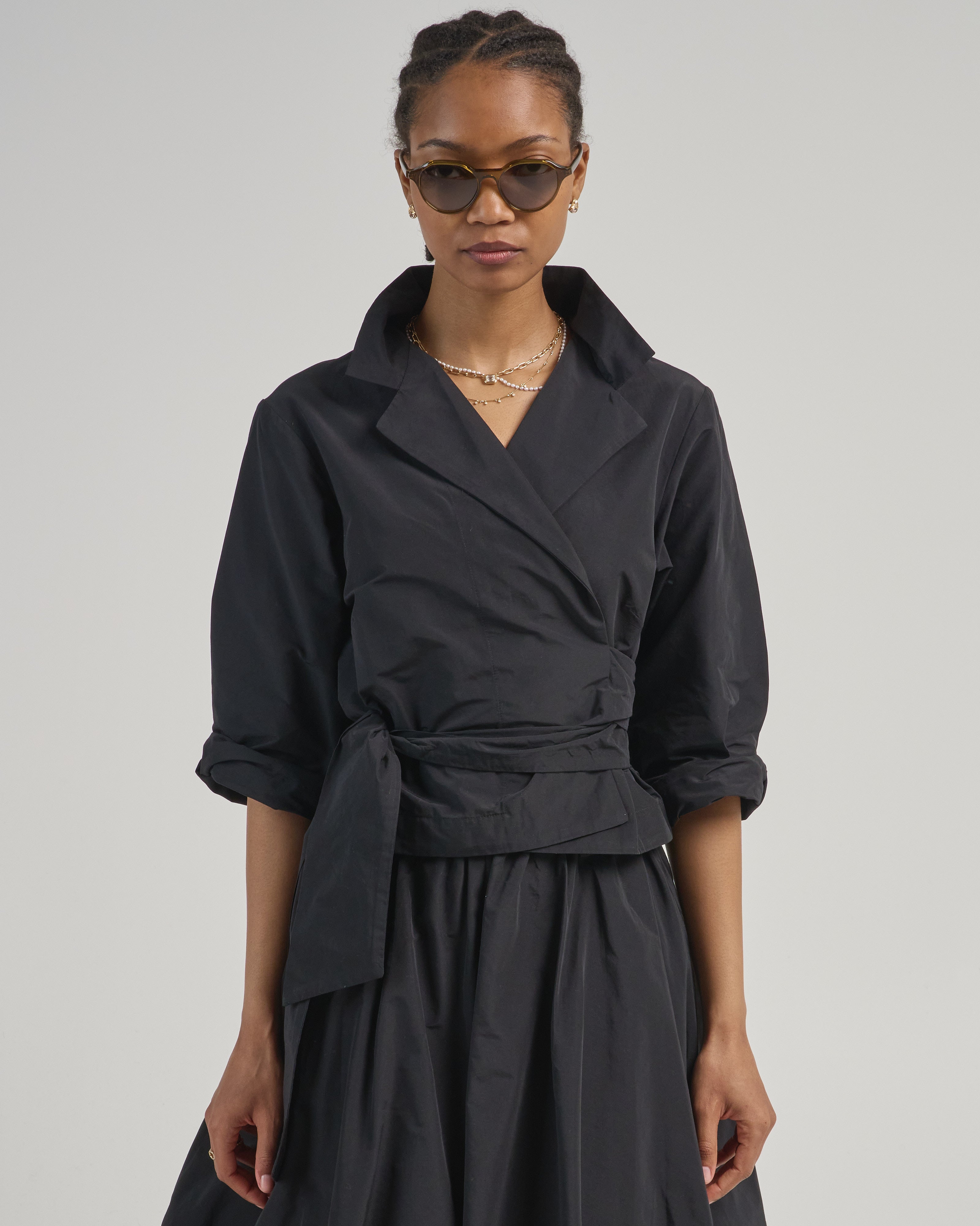- black 3/4 sleeve wrap blouse