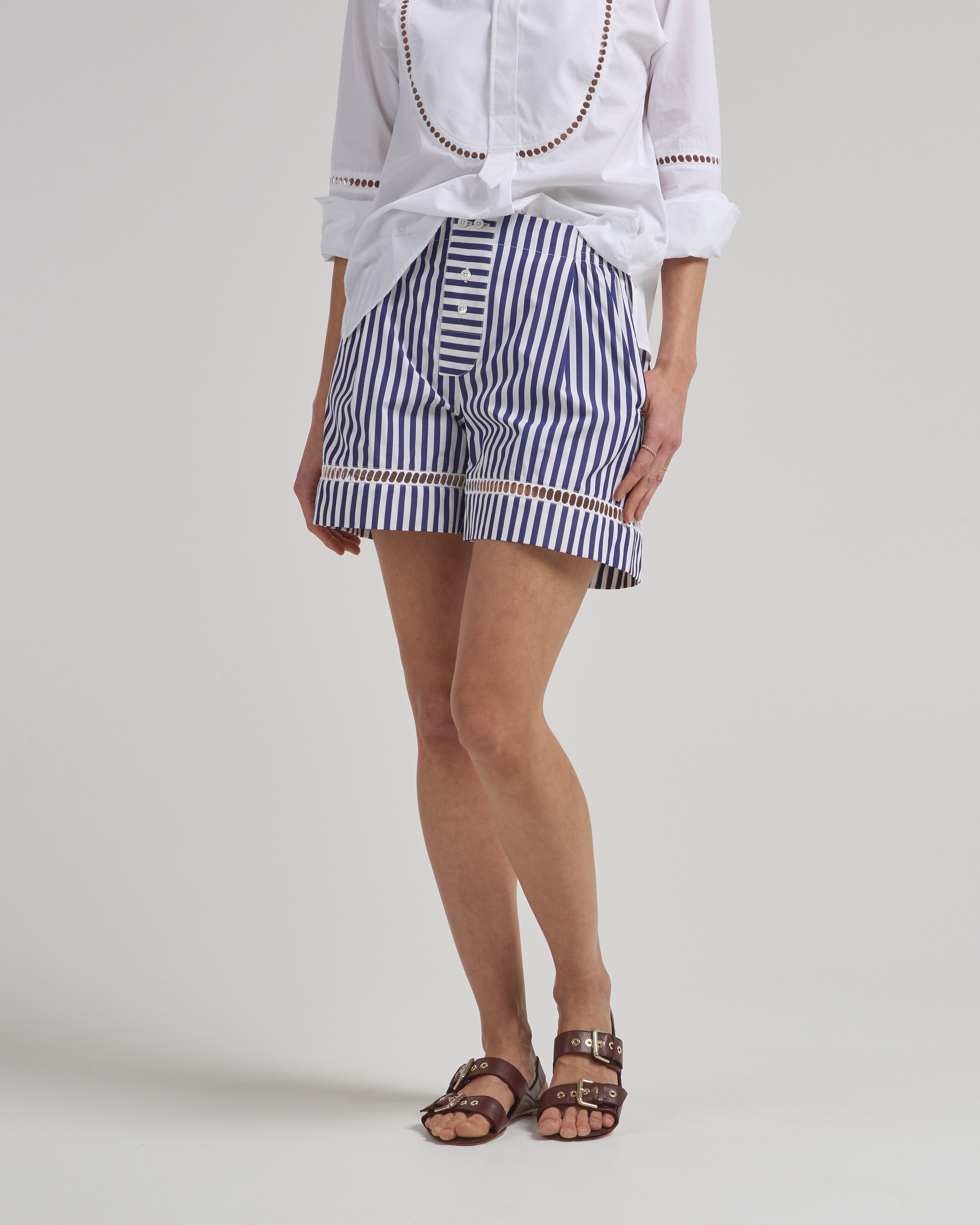 - blue and white striped boxer shorts