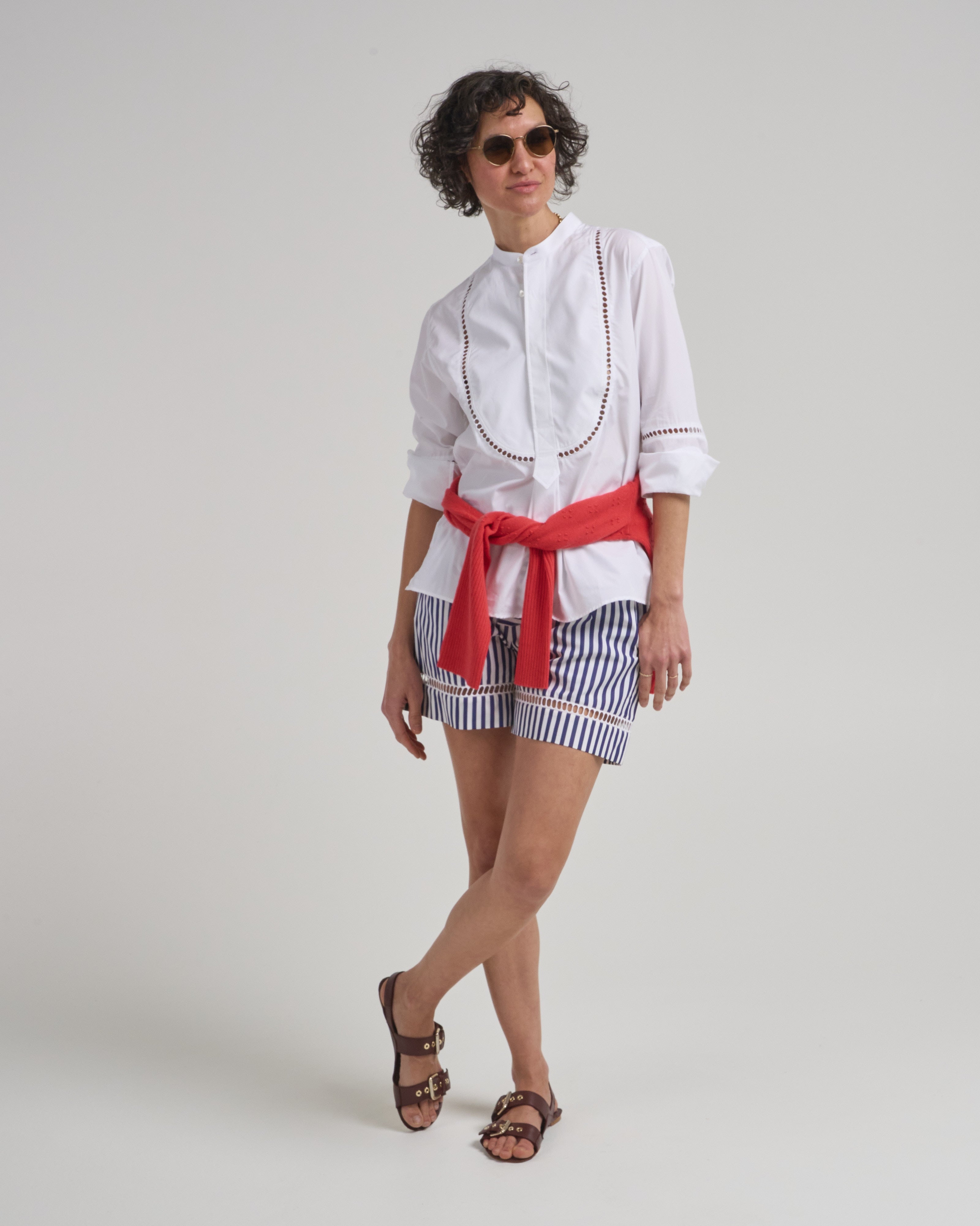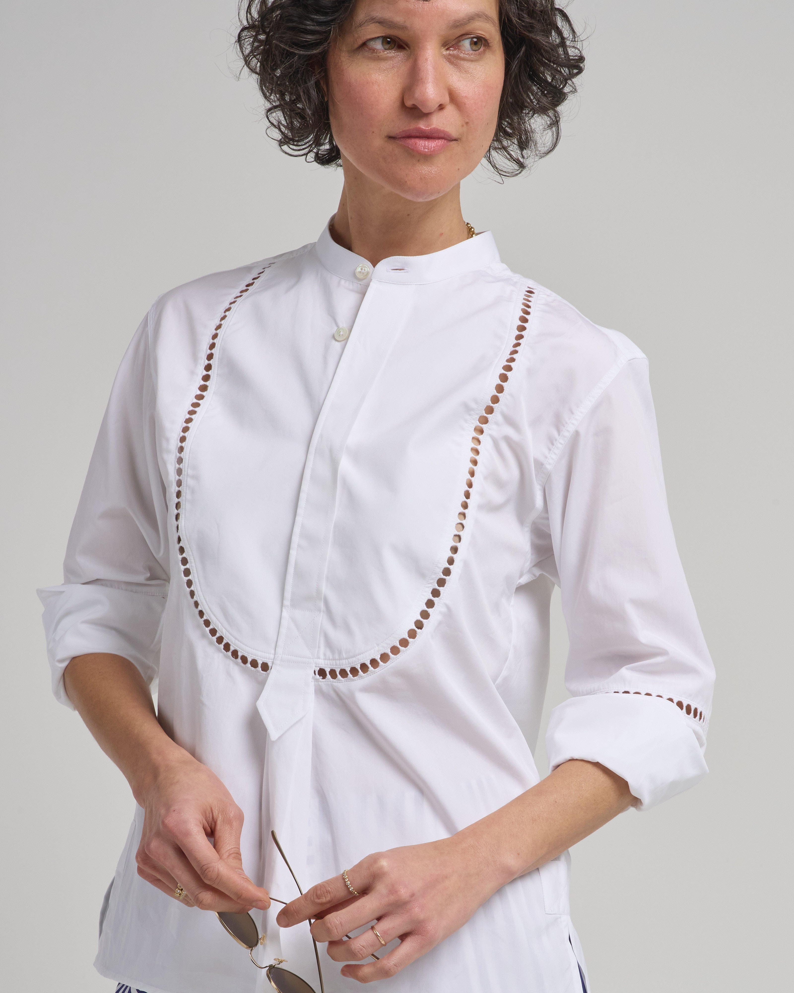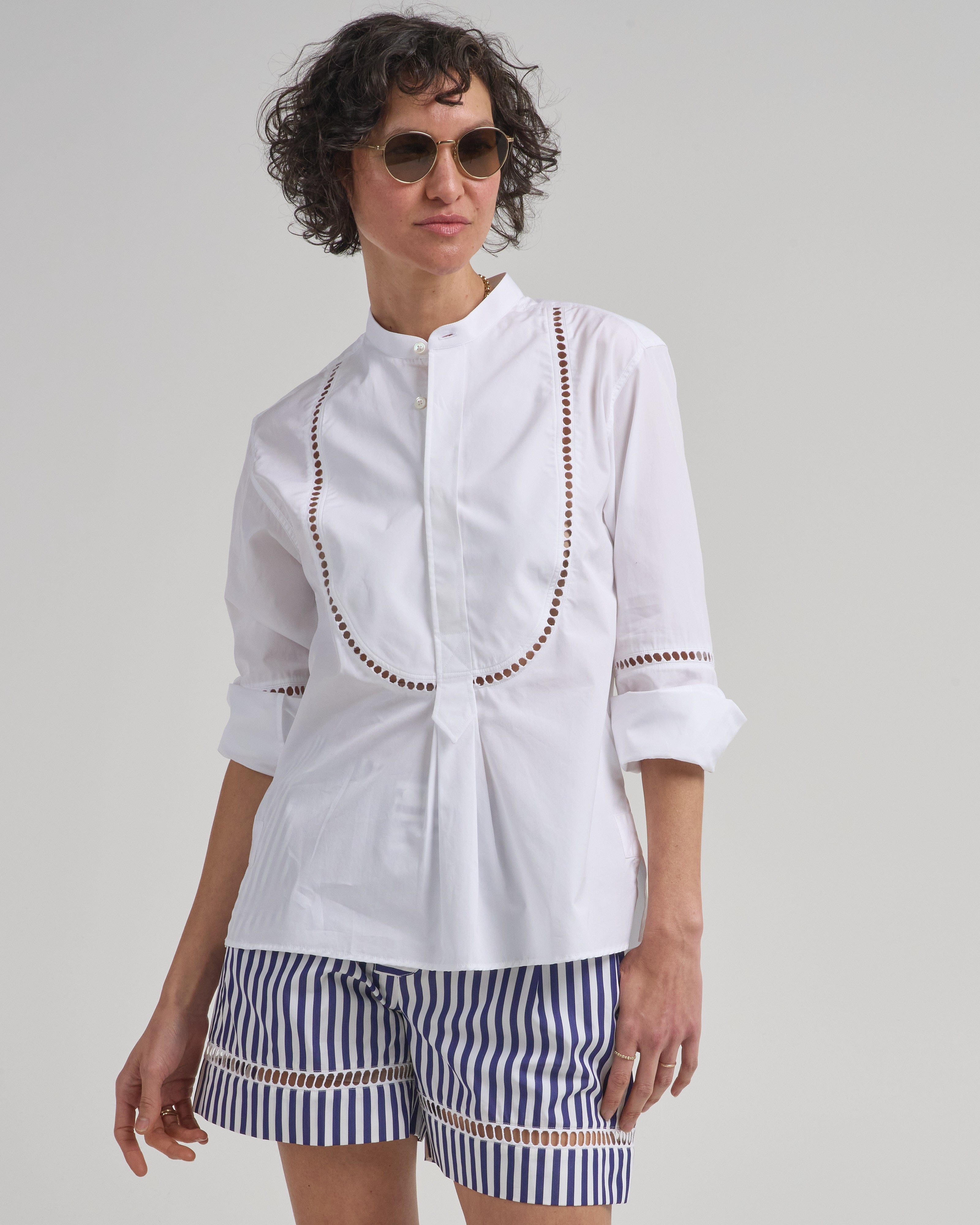 - pleated bib detail with concealed button placket