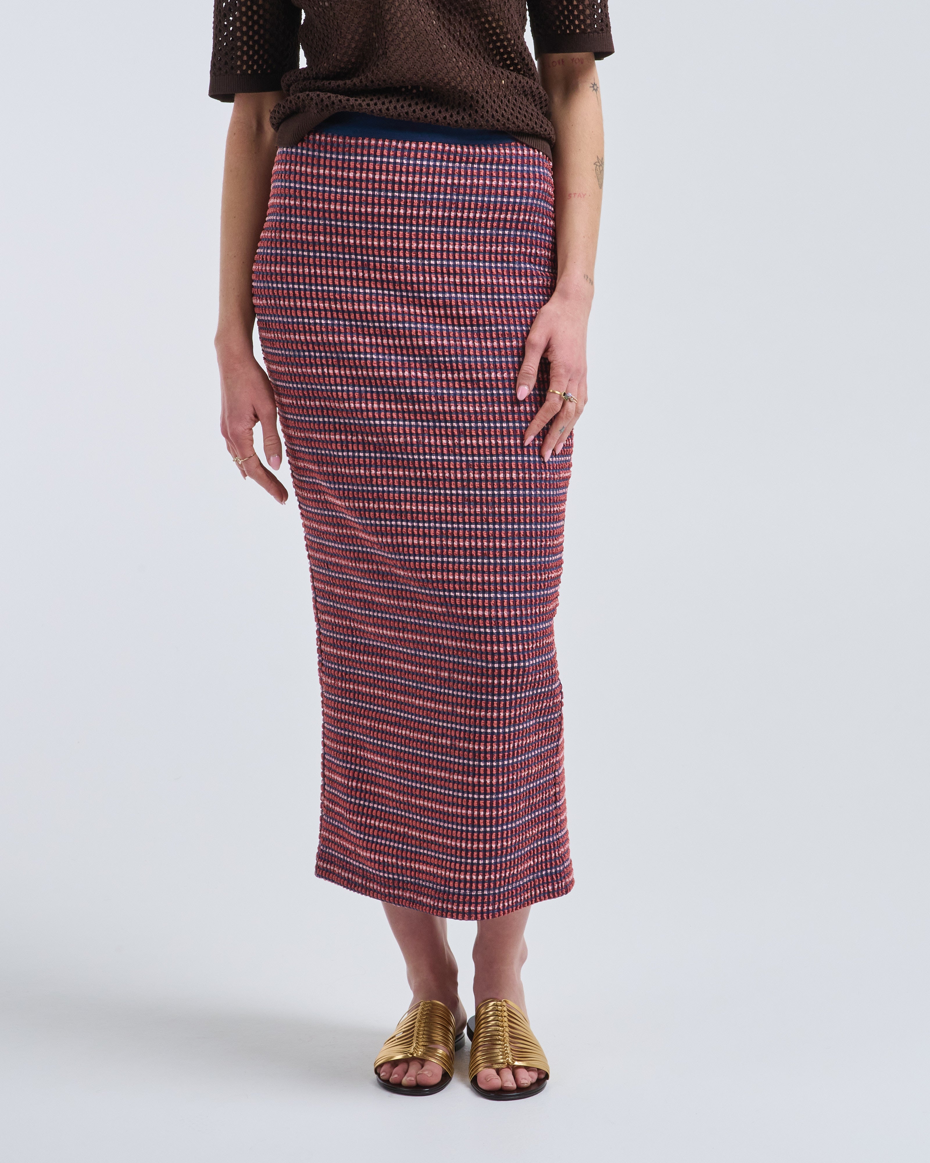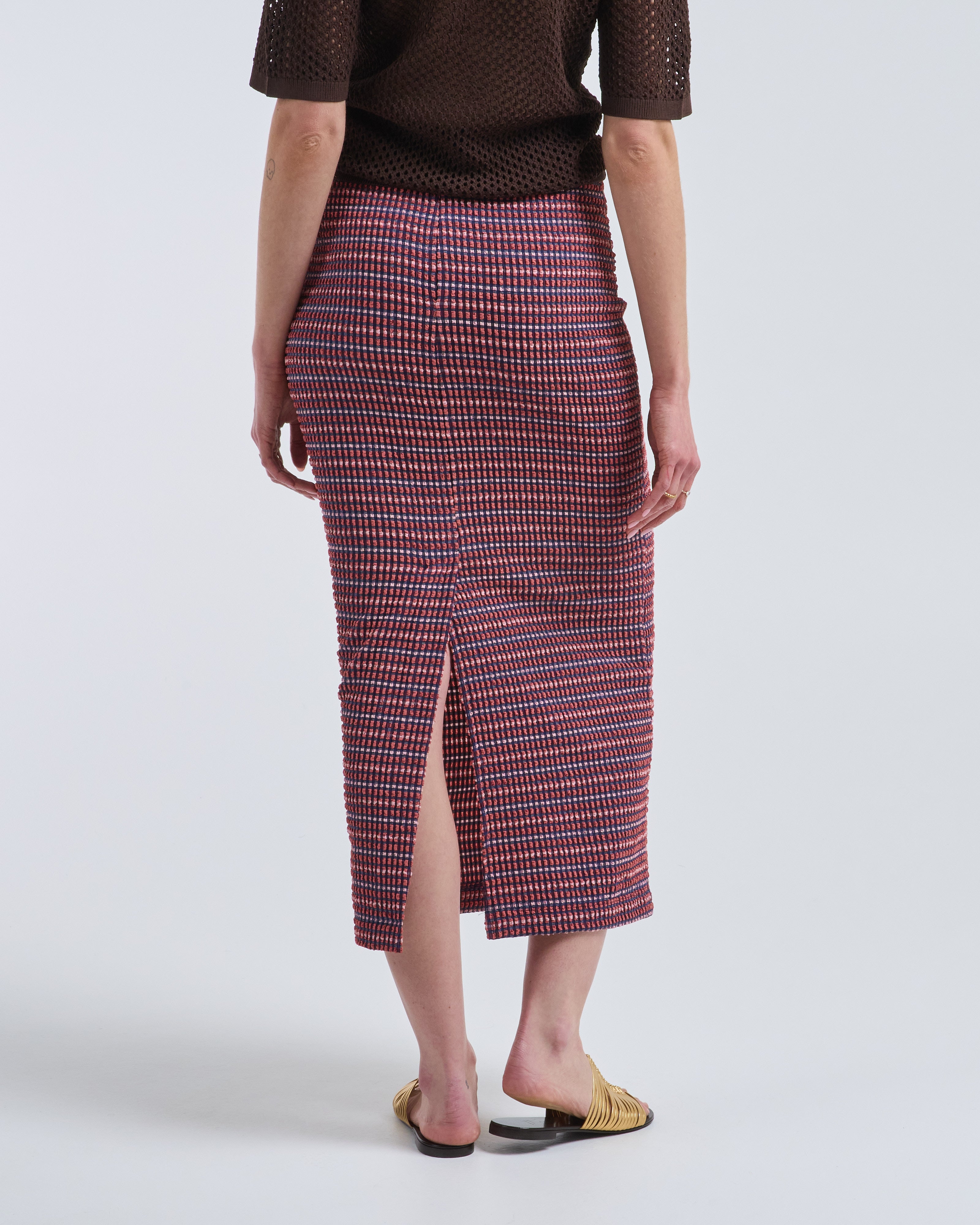 - pink and blue checkered skirt