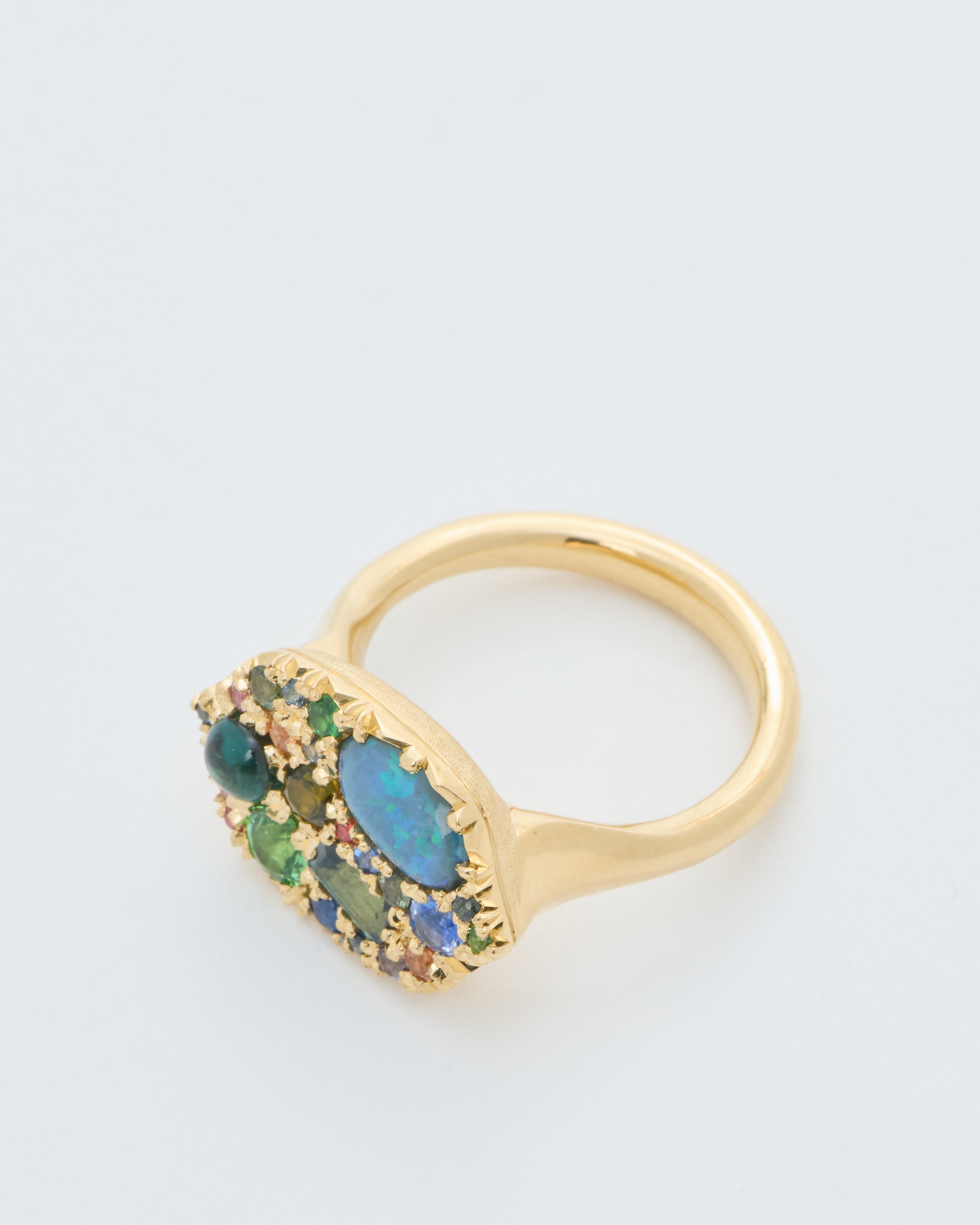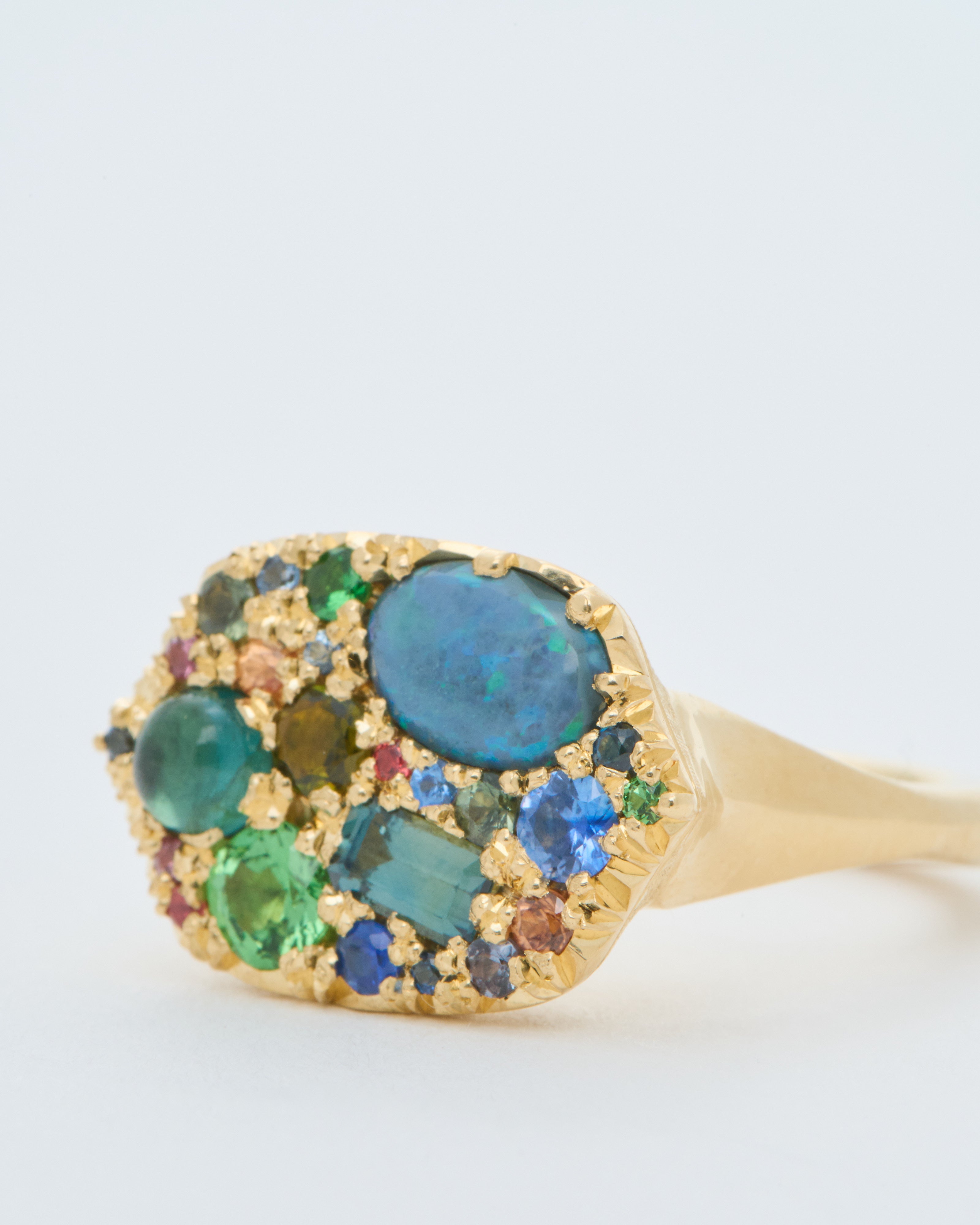 - set with a bespoke scatter of greens and blues: sapphires, black opals