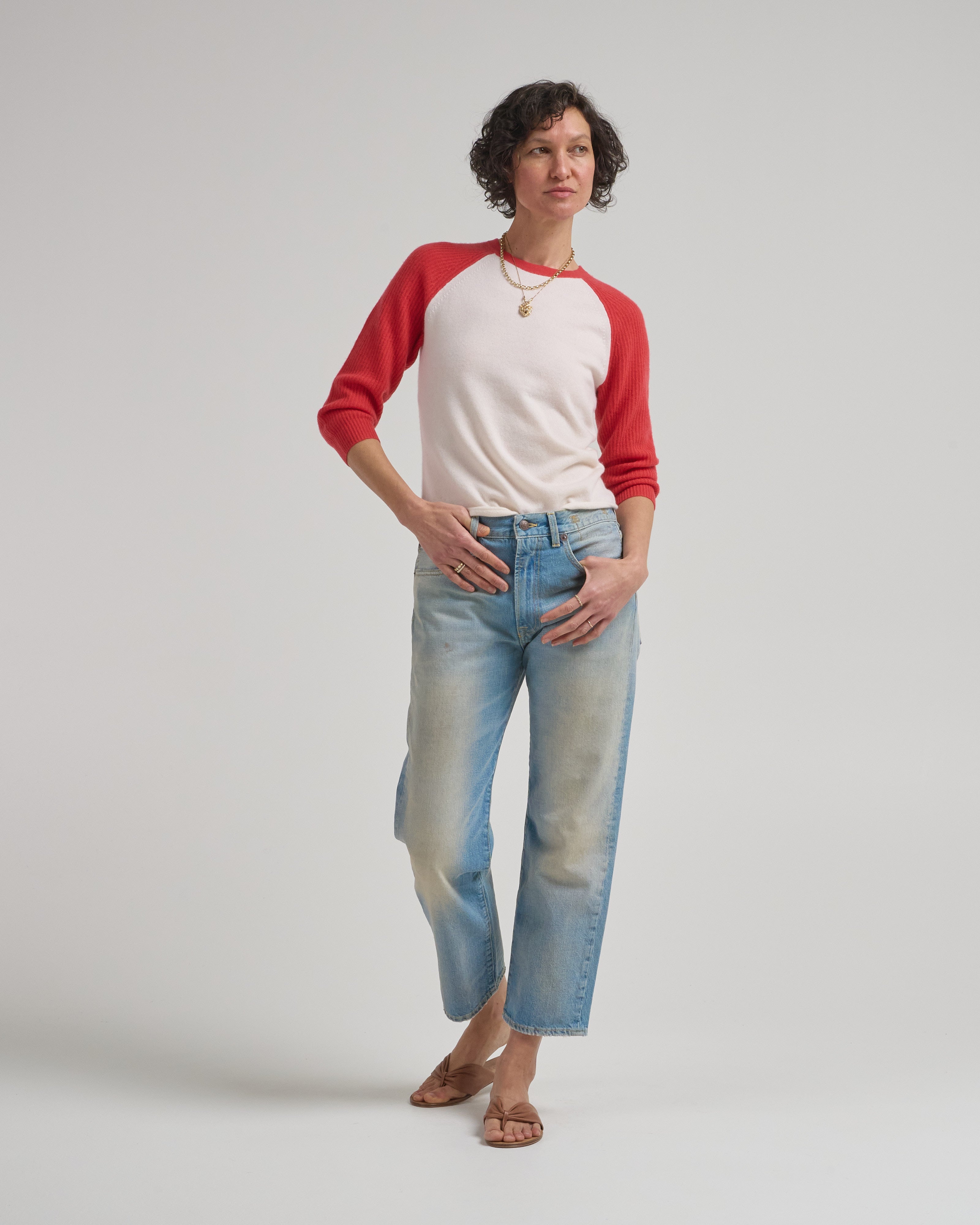 - beige and red bracelet sleeve tee