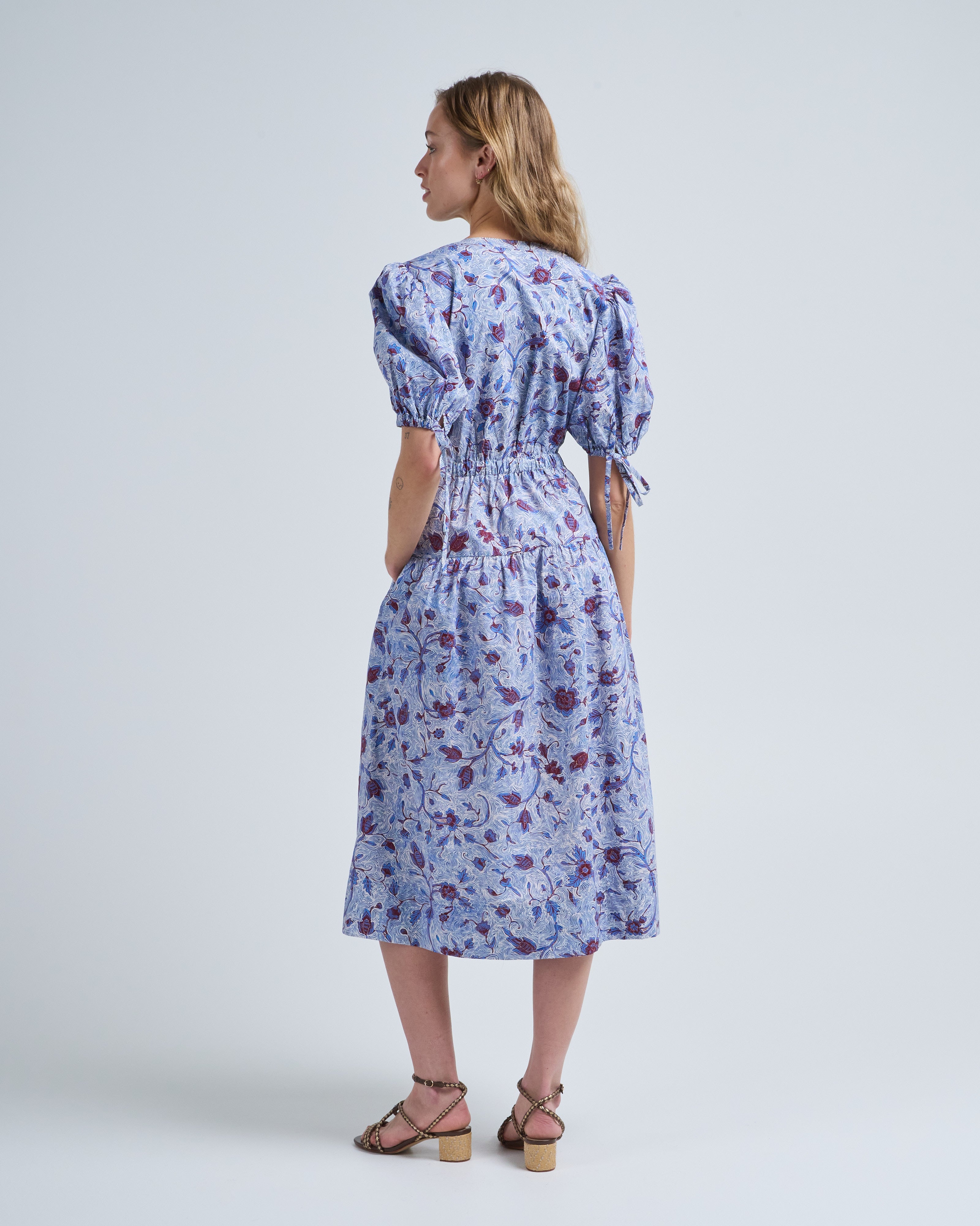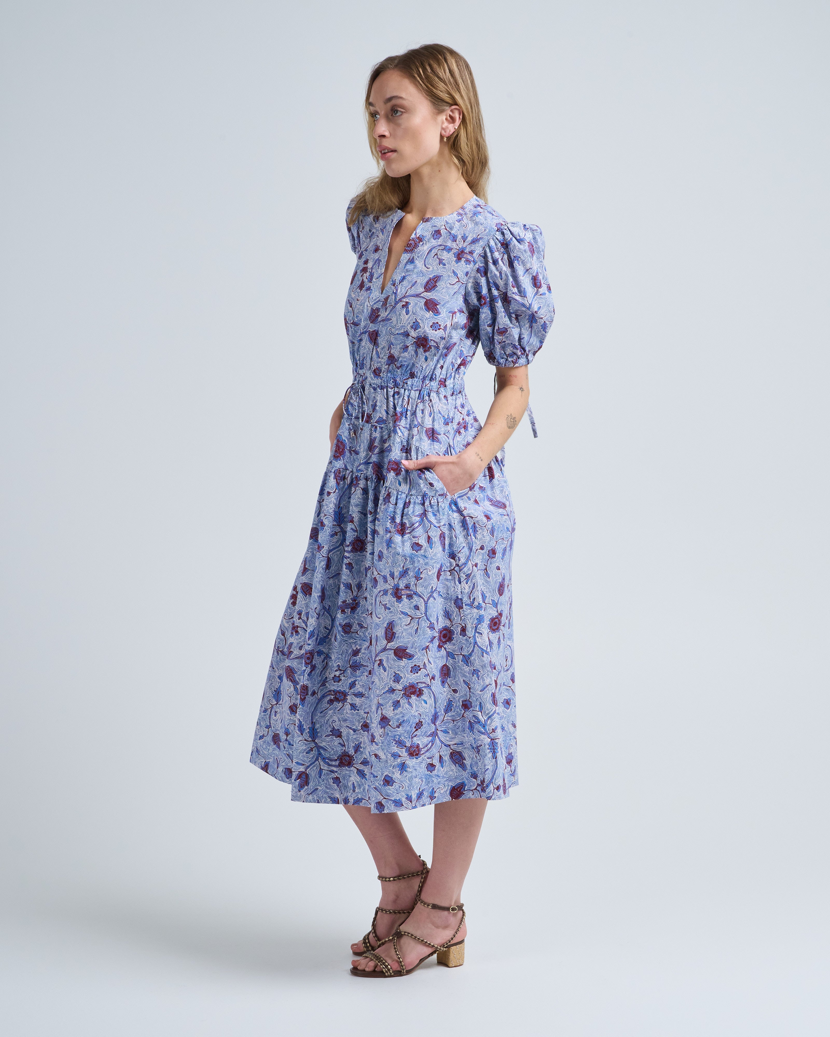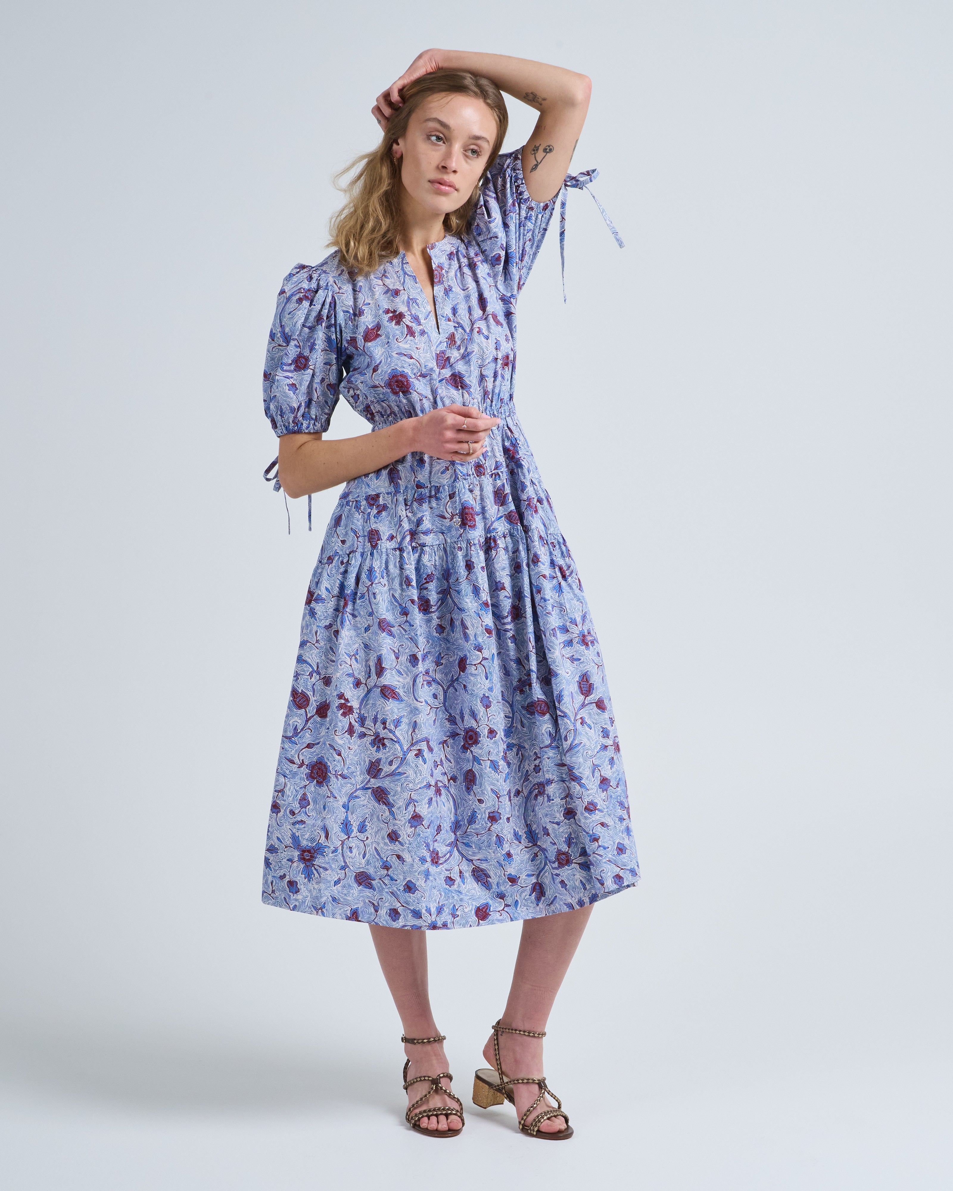 - blue, red, and white floral printed short sleeve dress
